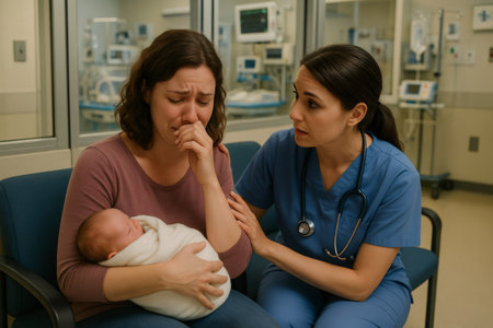 Doctor comforting a crying mother holding her newborn baby wrapped in a blanket, in a Neonatal Intensive Care Unit