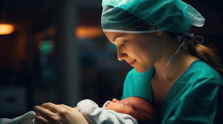 Nurse tenderly holding day old newborn baby, exuding genuine emotions of nurturing and care
