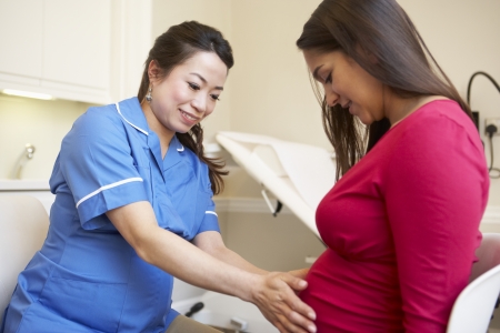 Midwife examining belly of pregnant woman with CTG scanning - Pregnant woman being examined by nurse Obstetrician Midwife using doppler monitor - Doctor performing an ultrasound scan on pregnant woman