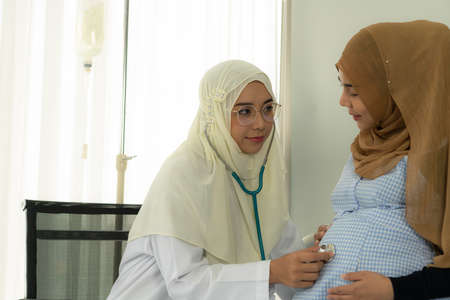 Pregnant muslim women pregnancy check up with Muslim doctors. To monitor the strength of the mother and child in the womb And rehearsing the give birth to child.