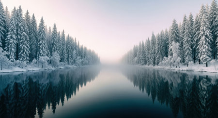 Snow covered spruce trees line a tranquil lake, their frosted branches perfectly reflected in the calm, dark blue water. a misty winter landscape creates a serene and peaceful natural scene.