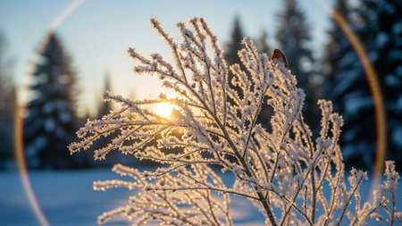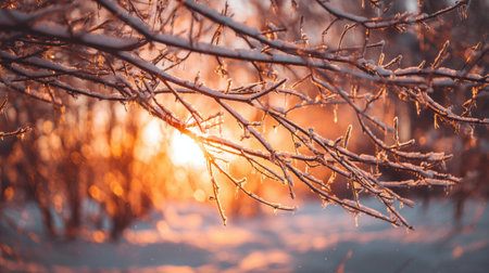 Frost coats the branches as the sun rises, casting a warm glow on the snowy scene with blurred outlines in the background.
