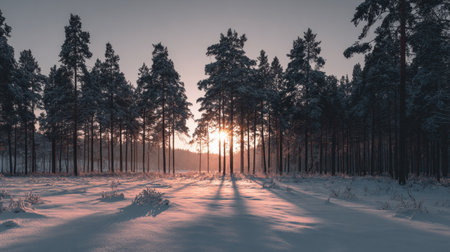 A stunning view of a snow-covered forest with the sun setting in the background. The trees are tall and majestic, and the snow is pristine and white.