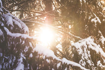 Snow covered pine tree branches in winter forest. Beautiful nature background.
