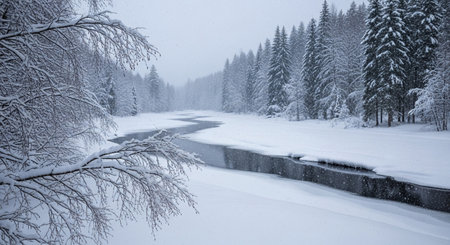 Scenic winter landscape with snow-covered trees and stream