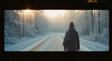 A person standing on a snowy road surrounded by trees, with a soft sunrise in the background, evoking a sense of solitude and tranquility
