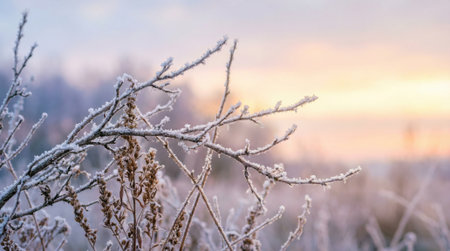 A tranquil winter scene featuring delicate branches covered in white hoarfrost. The soft focus background shows a beautiful sunrise with warm and cool tones.