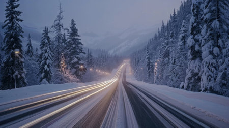 A snowy highway with car light trails streaking by like shooting stars adding a touch of excitement to the winter landscape