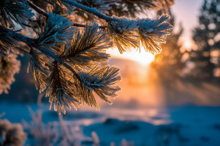 Delicate pine needles coated in frost sparkle under a gentle, amber morning glow, contrasting against a softly blurred winter forest blanketed in snow.