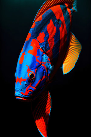 This image showcases a close-up of a vibrant fish, exhibiting a complex pattern of red, blue, and white scales. The fish's texture is detailed and striking, highlighted against a black backdrop. This visual could be useful for educational materials, design projects, or general decorative purposes, offering a unique aesthetic appeal.