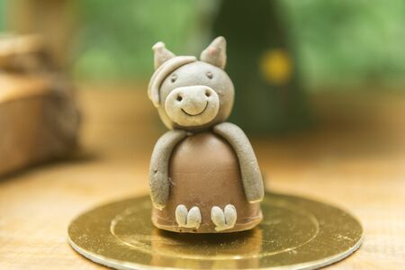 Kids Party Decoration - Farm Theme. Shaped candy personalized. Cake table detail. Handmade sweets with great care. Childhood and joy concept. Copy space Selective focus.