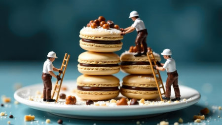Two men are building a tower of macarons. The macarons are stacked on top of each other, and the men are using their hands to place them on top of each other. The scene is playful and whimsical