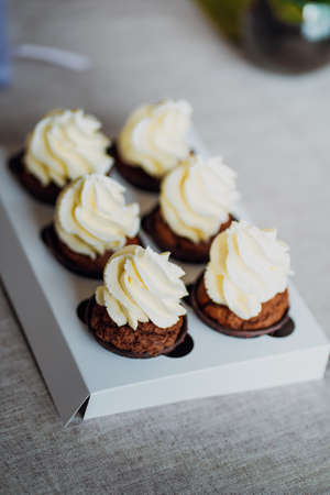 Chocolate cupcakes with whipped cream on a white plate. Selective focus.