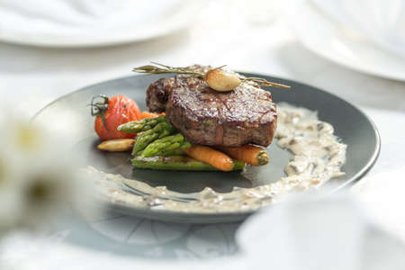 Closeup of a steak with vegetables in a restaurant setting. FILET MIGNON.