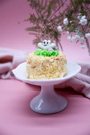 A beautiful cake is green, it sits a sugar lamb as the grass, spring design