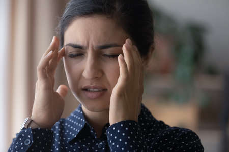 Stressed indian girl sit on couch touch temples to reduce severe strong unbearable head ache. Sick or desperate woman frown face close up image. Panic attack, mental physical problems patient concept