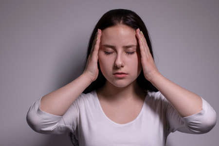 Portrait of young dark hair woman, annoyed and frustrated. She is touching her temples. Headache, mental disorders bulimia, addiction.