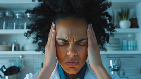 A young woman shows signs of stress and headache, placing her hands on her temples, in a cozy indoor setting with softly blurred lights, capturing a moment of intense emotion.