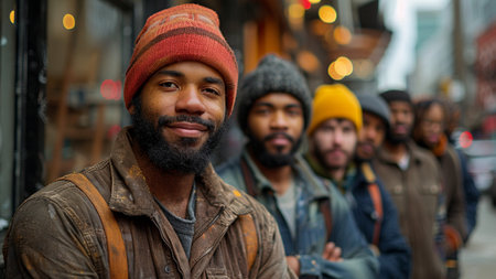 Portrait of a handsome African-American man with a beard, wearing a hat and a leather jacket, standing on the street in New York.