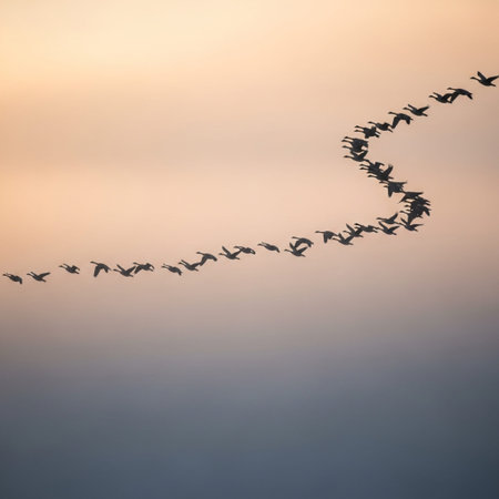 A flock of geese flying in a V-formation, their honking echoing through the sky.