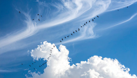 Cranes moving information in the sky. Migratory birds on the Darss. 100000 birds migrate every year in autumn from the north to the south and back again in spring. A natural spectacle that attracts many visitors.