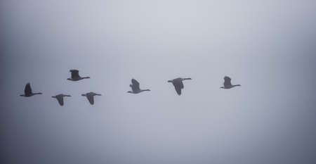 Canadian Geese in the fog. A gaggle of Canadian Geese navigate in the fog and waters on their way south.