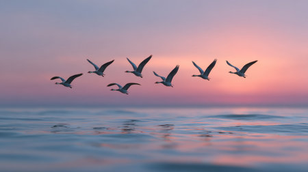 A breathtaking scene capturing a flock of birds gracefully flying over tranquil ocean waters during a stunning sunset. The colors transition softly in the background, enhancing the serene atmosphere.