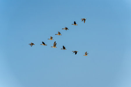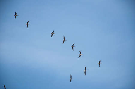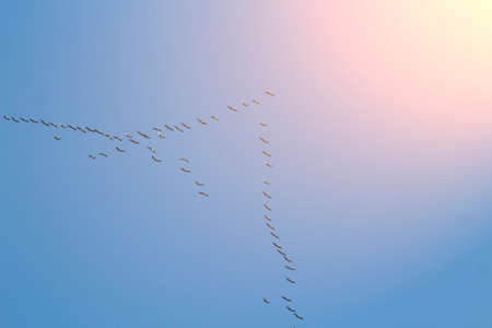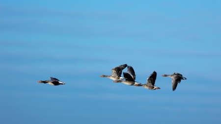 Blue sky with greylag geese migration from south to north in sunlight of spring