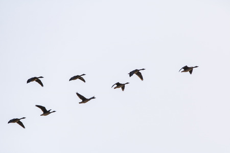 A big flock of barnacle gooses is flying in the sky. Birds are preparing to migrate south.
