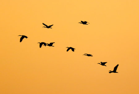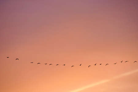 Silhouette of a group of ducks and geese flying in the orange sky of a winter day in the Lagunas de Villafáfila Natural Reserve in Spain.