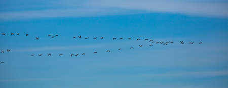 Flock detailed Geese flying in a beautiful blue sky. birds flying in the shape of. Animal themes, background, copy space.