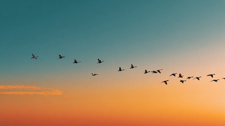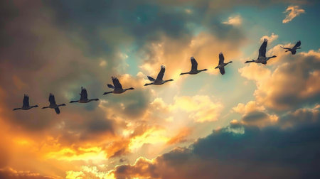 Flock of Geese in Classic V Formation, Their Silhouettes Set Against a Golden Sunset Sky
