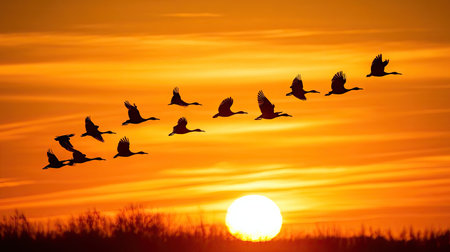 A stunning image capturing a flock of birds in flight against a breathtaking sunset. The vibrant orange and yellow sky creates a tranquil scene over the silhouetted landscape.