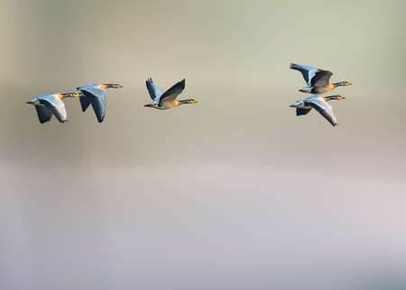 Beautiful duck group flying with soft morning sunrise light. Clouds in the background and warm tone.
