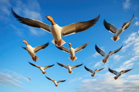 Flock of geese flying in summer