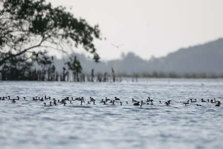 A flock of great crested greylag ducks swimming in a lake.
