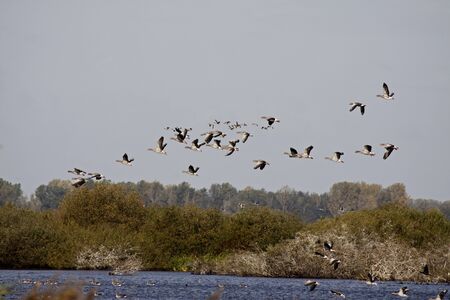 Flock of geese flying in the sky or a natural park in winter