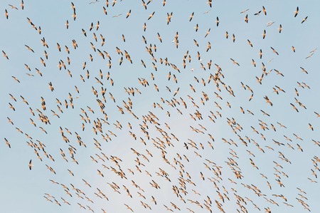 Flock of Black-tailed Godwit, Anser anser, in flight