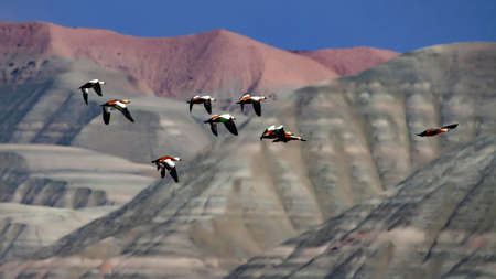 A flock of great crested geese flying in the desert.