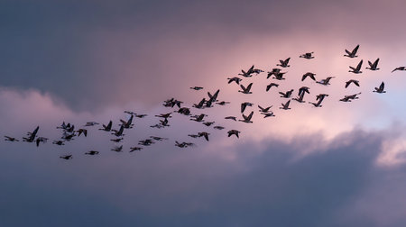 Seasonal autumn or spring migration of birds over purple sunset