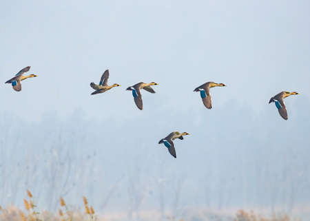 A group of spot billed ducks on flight