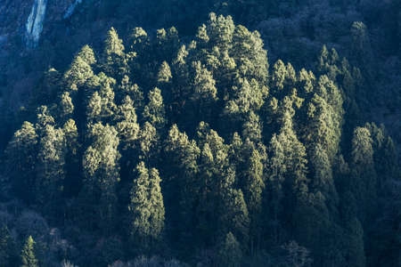 Mountain forest with fog against dramatic sky on the background. Japan
