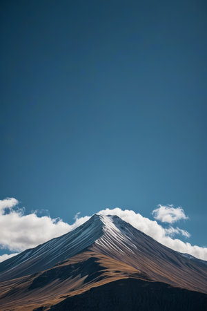 Snowy mountain vista under blue sky and white clouds