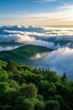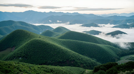 Experience the tranquil beauty of a mountain landscape where rolling hills meet soft clouds, offering a breathtaking view that invites exploration and connection with nature.