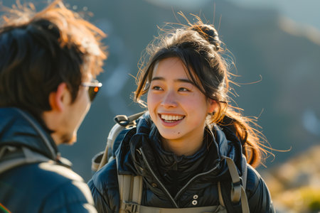A backpacking couple is happily chatting on top of a mountain.