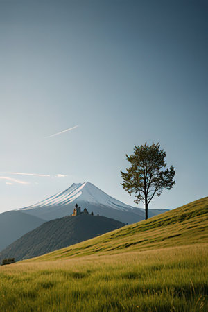 Mt. Fuji and the green meadow at sunrise