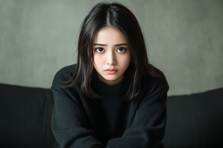 Young woman with straight dark hair wearing a black sweater, sitting indoors on a dark couch, gazing seriously at the camera