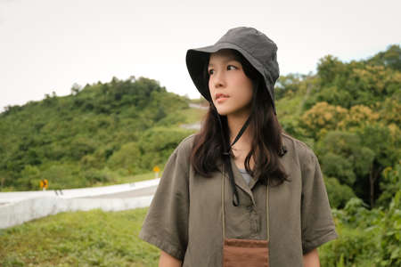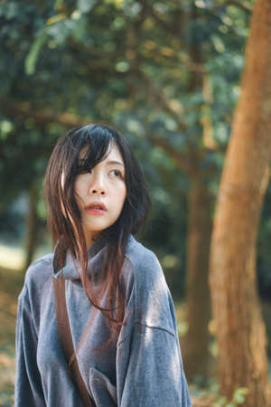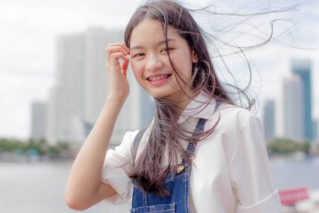 Asian cute girl teen innocent shy smiling happiness moment with nature sunshine beautiful background