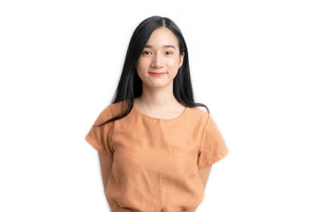Portrait of a teenager asian woman feeling happy smiling and looking at the camera over white background.