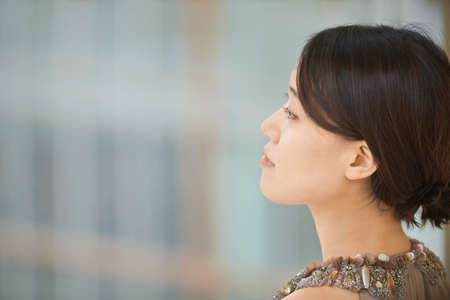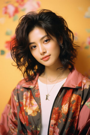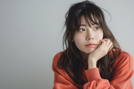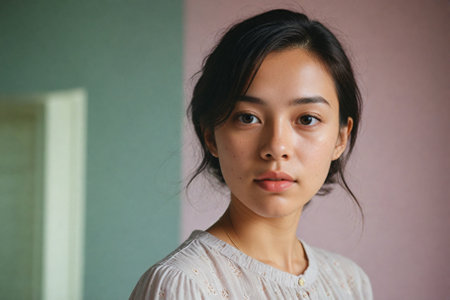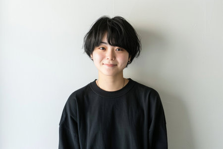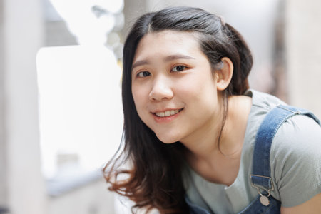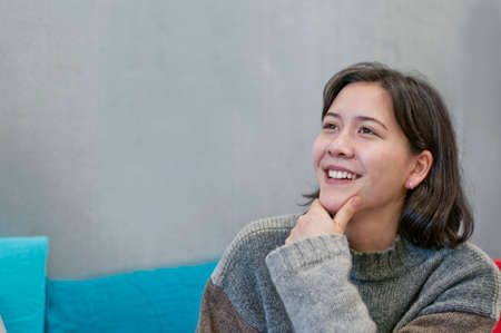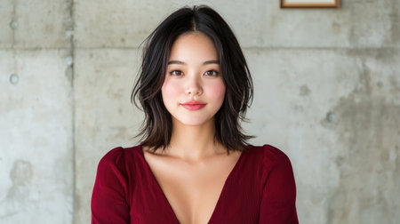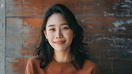 Pretty Asian individual with a warm, inviting smile, background for copy space or marketing purposes